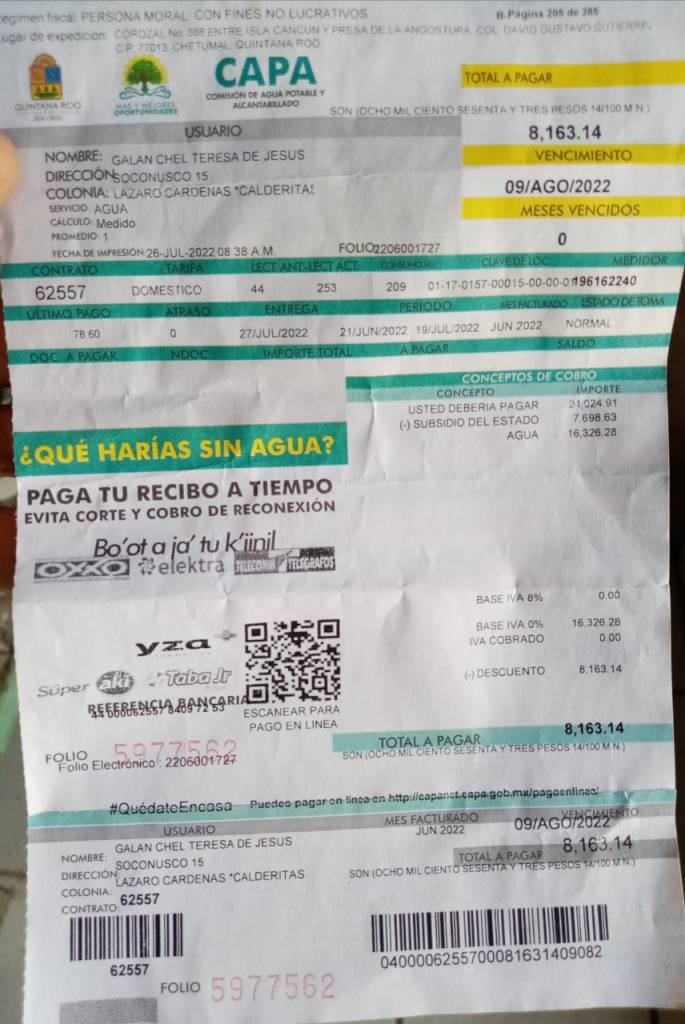 Lamentable actuar de la Comisión de Agua Potable y Alcantarillado (CAPA) a quien denuncian por realizar un descarado robo, ya que le están cobrando más de ocho mil pesos a una abuelita de Chetumal, con más del 11 mil porciento de lo que normalmente pagaba.