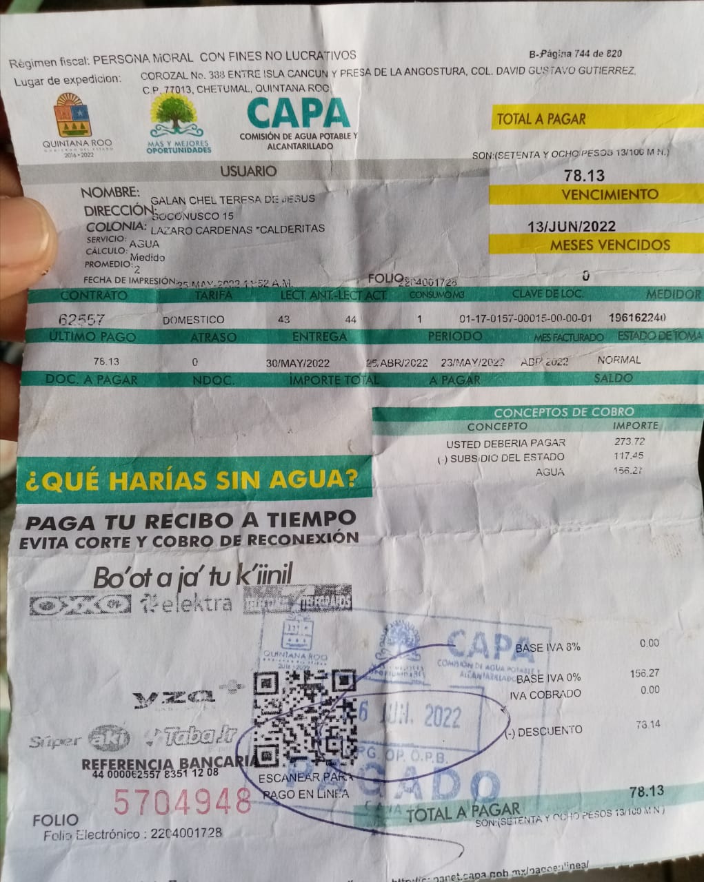 La abuelita se llama Teresa de Jesús Galán Chel, una mujer de más de 60 años, que vive sobre la calle Soconusco en la comunidad de Calderitas, quién dijo está muy preocupada ya que no tiene el recurso para pagar semejante deuda que le están poniendo por la Comisión de Agua Potable y Alcantarillado (CAPA).