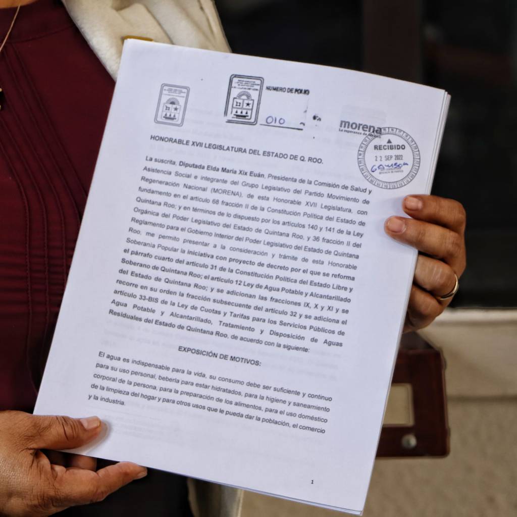 Atendiendo una de las principales demandas ciudadanas recibidas en campaña, la diputada de Morena, Elda Xix Eúan, presentó ante la Oficialía de Partes del Congreso del Estado, su primera iniciativa que busca reformar la Constitución Política del Estado, la Ley de Agua Potable y la Ley de Cuotas y Tarifas del Agua Potable.
