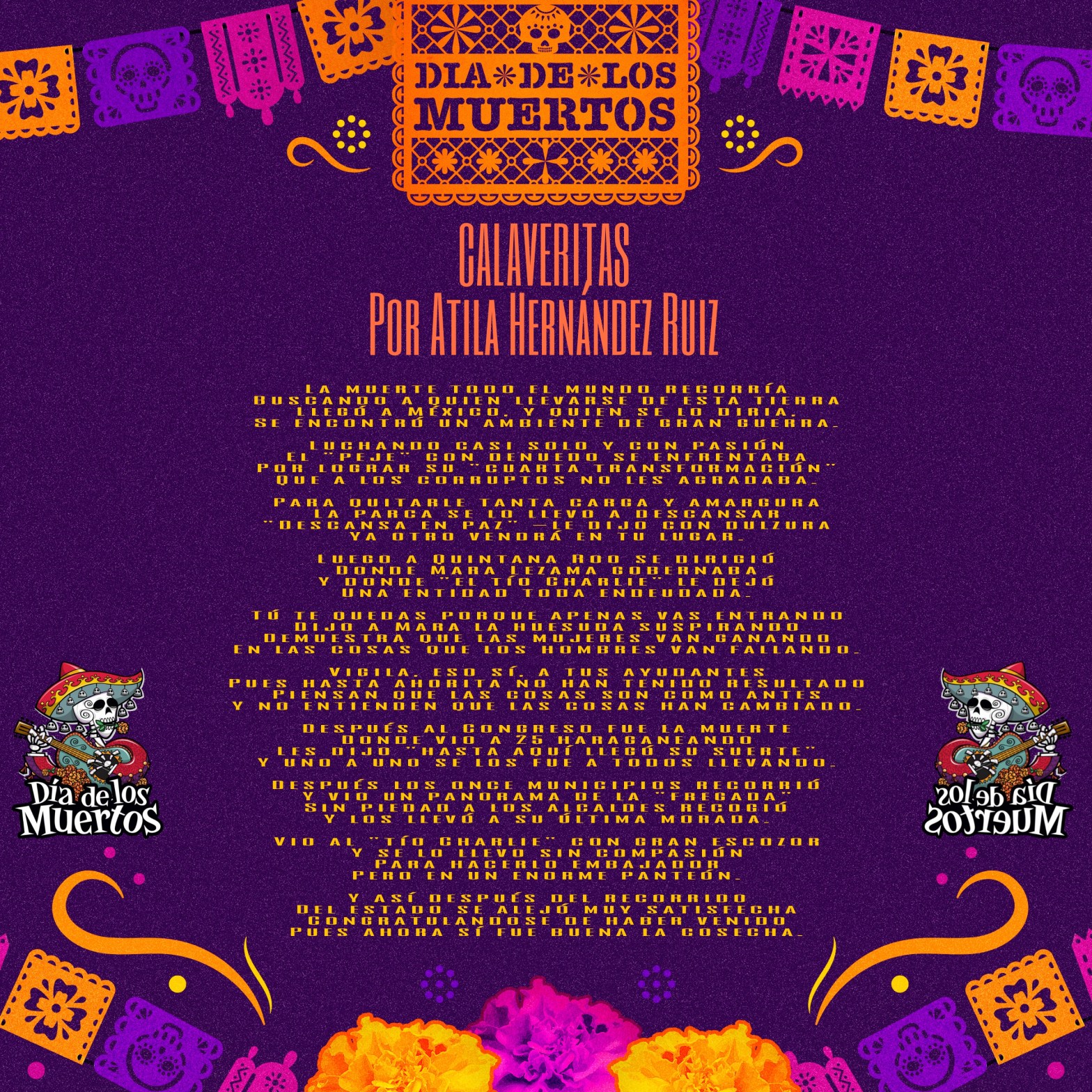 Por Atila Hernández RuizLa muerte todo el mundo recorríaBuscando a quien llevarse de esta tierraLlegó a México, y quien se lo diria,Se encontró un ambiente de gran guerra.Luchando casi solo y con pasiónEl «peje» con denuedo se enfrentabaPor lograr su «cuarta transformación»Que a los corruptos no les agradaba.Para quitarle tanta carga y amarguraLa parca seSigueSigue leyendo «Calaveritas»