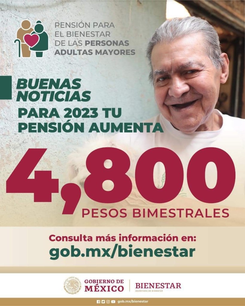 La Pensión para el Bienestar de las Personas Adultas Mayores se incrementa 25 por ciento y pasará de tres mil 850 pesos en 2022 a cuatro mil 800 pesos bimestrales en 2023, mientras que el padrón crecerá de 10 millones 537 mil 181 derechohabientes a 11 millones 56 mil 534 en el primer bimestre del año, anunció la secretaria de Bienestar, Ariadna Montiel Reyes, en la conferencia de prensa matutina del