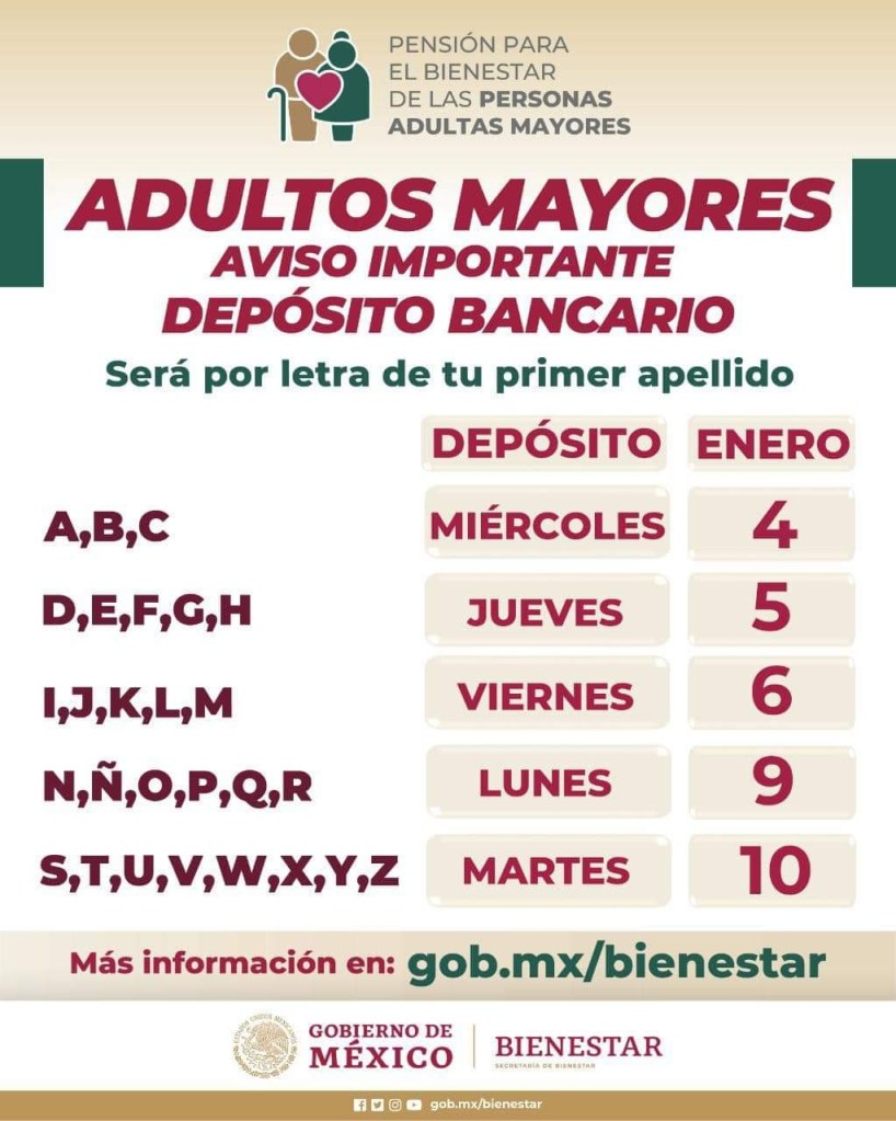 Informó que del 4 al 10 de enero se realizará la dispersión de pagos correspondiente al bimestre enero-febrero, ya con el incremento, y para mejor atención de los derechohabientes este depósito se realizará de acuerdo con la letra del primer apellido.