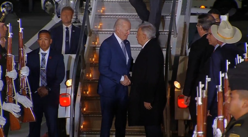 Al bajar del aeronave el presidente de los Estados Unidos, Joe Biden fue recibido por Andrés Manuel López Obrador presidente de México a quién le dio el saludo de mano y acompaño hasta abordar la unidad en la que se iban a retirar.