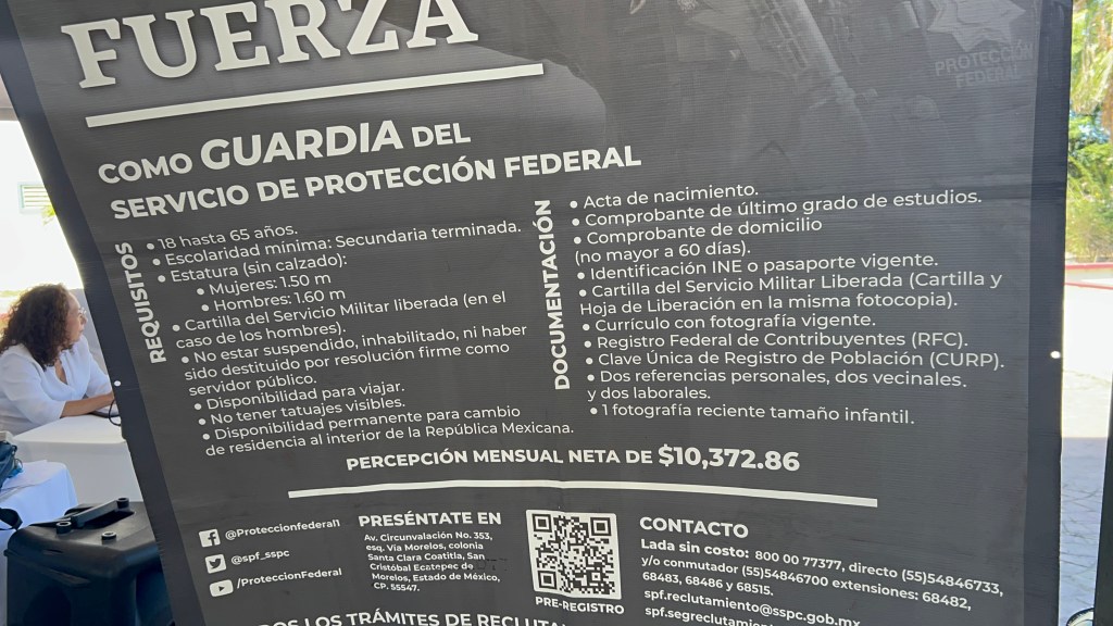 Al respecto Salvador Andrade, perteneciente al Servicio de Protección Federal y quién es parte del equipo de reclutamiento, señaló que las personas interesadas en Quintana Roo tienen que presentar diversos documentos, entre los que se destaca la cartilla militar liberada, para así poder ser examinados y buscar ser beneficiados con uno de estos puestos de guardia de seguridad que tiene el Servicio de Protección Federal en Quintana Roo.
