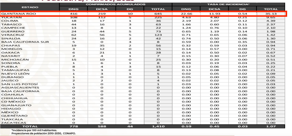 El estado de Quintana Roo, se mantiene en la primera posición a nivel nacional como la entidad con mayor numero de casos de Dengue, situación que continua marcando una tendencia desde el inicio del 2023, y que cada vez muestra mayor cantidad de estos, al grado que al termino de la semana epidemiológica numero 10 se pudieron contabilizar un total de 645 casos de dengue en todo Quintana Roo, entre estos hay casos de dengue no grave y dengue con síntomas agudos o dengue grave.