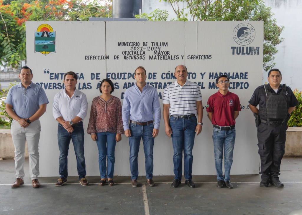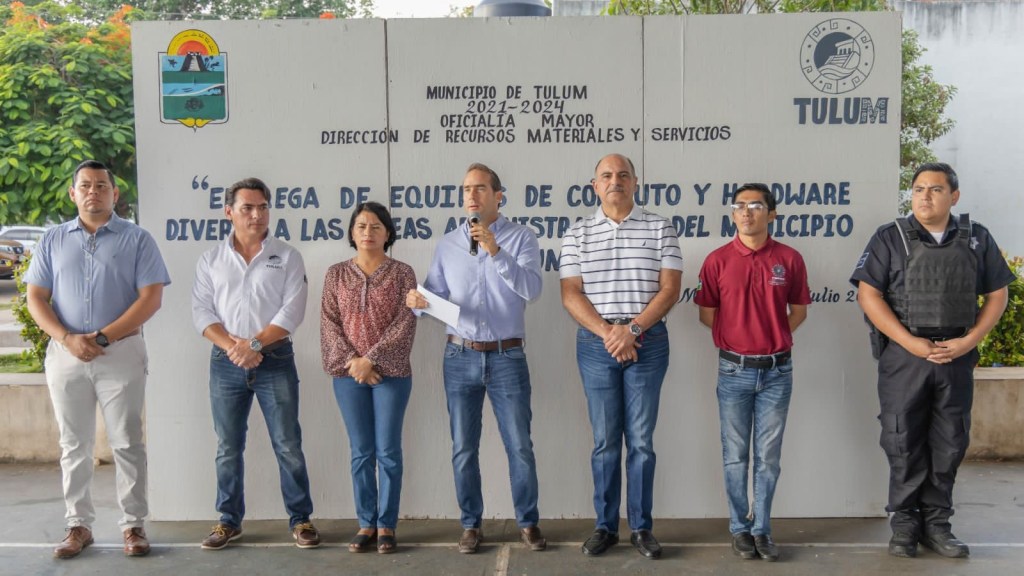 Tulum, 18 de julio del 2023.- El Presidente Municipal de Tulum, Diego Castañón Trejo encabezó la entrega de equipos de cómputo y hardware diverso a las áreas administrativas del Ayuntamiento, con una inversión de $4, 199,769 pesos provenientes de recaudación propia y con la premisa de volver más eficiente el servicio a las y los Tulumnenses.