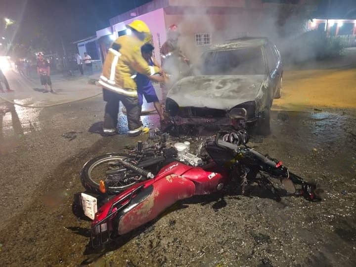Este percance se registró en la calle 81 con 82, de la Colonia Jesús Martínez Ross, y de acuerdo a la información preliminar, un sujeto en estado de ebriedad circulaba en una camioneta tipo Avalanche e impactó de frente a una motocicleta, en la cual viajaba una familia compuesta por tres personas, la familia cayó al pavimento y la moto fue arrastrada por varios metros lo que provocó el incendio que se propagó rápidamente.