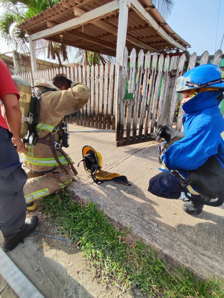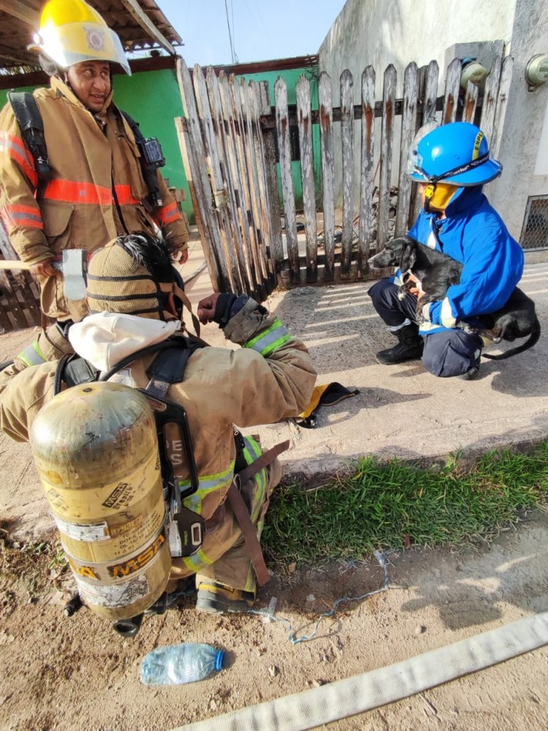 Un perrito había quedado atrapado dentro de la vivienda por lo que el personal de bomberos no dudó en ingresar a salvarle la vida, sacándolo sano y salvo de la casa y recibiendo también oxigenación debido a que inhaló humo tóxico.