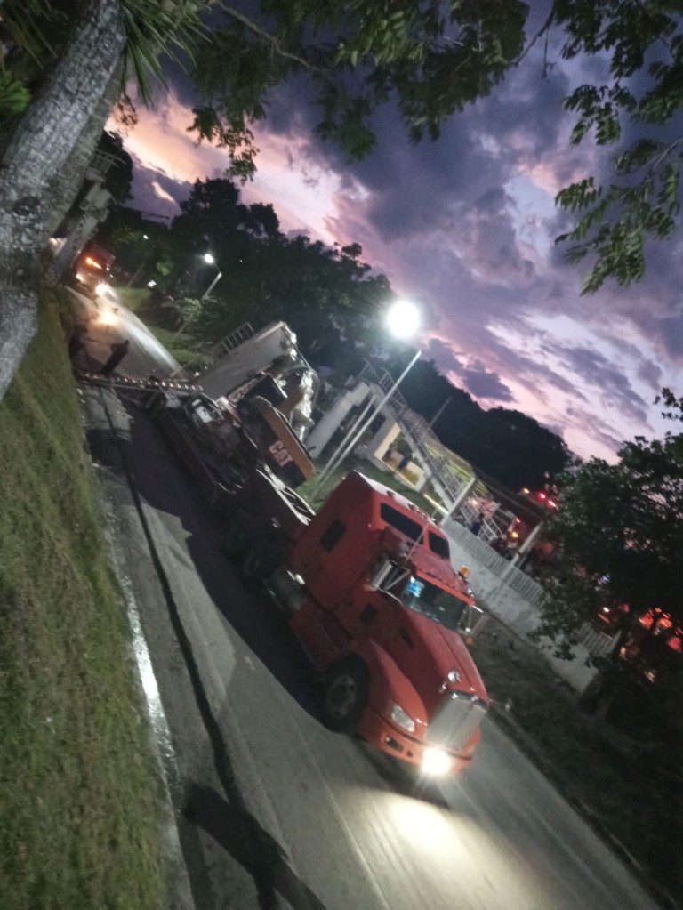 La carretera federal 186 se mantiene obstaculizada a la altura de Nicolás Bravo, luego de que un luego de que un puente peatonal fuera derribado por un trailer que transportaba maquinaria a las obras del Tren Maya en el tramo 7 frente 2.