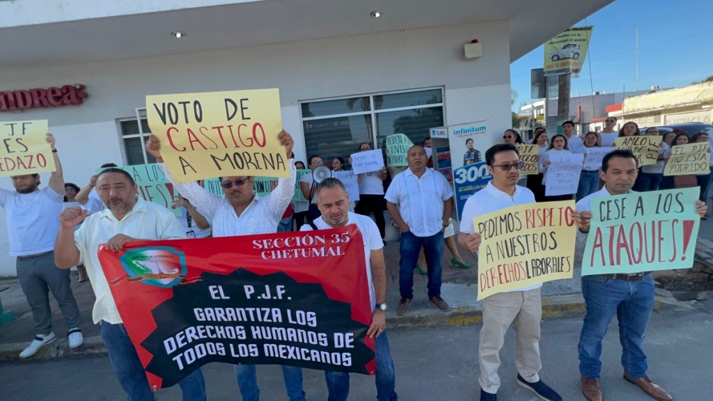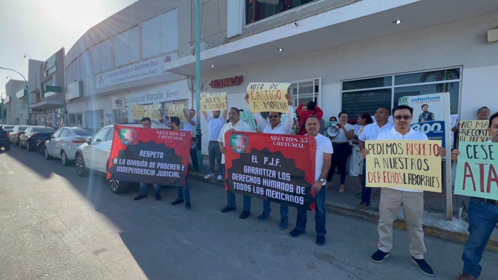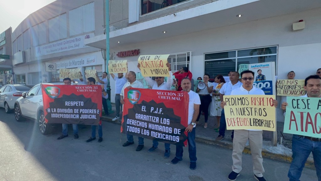 Al menos 60 trabajadores de los juzgados primero y sexto de distrito en la ciudad de Chetumal alzaron su voz en protesta hoy, manifestándose a las afueras del edificio del poder judicial de la Federación. Su indignación se centra en la decisión de extinguir 13 de los 14 fideicomisos que respaldan su labor, una medida que podría tener graves repercusiones en su estabilidad laboral señalan los inconformes.