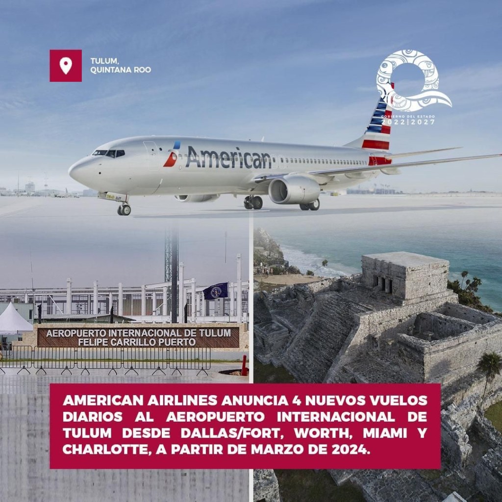 Chetumal.- La gobernadora Mara Lezama Espinosa dio a conocer que American Airlines confirmó que a partir del 28 de marzo próximo se convertirá en la mayor aerolínea estadounidense en el aeropuerto internacional de Tulum, al operar cuatro vuelos diarios en este destino, incluyendo dos vuelos diarios a Dallas/Fort Worth (DFW) y un servicio diario a Charlotte (CLT) y Miami (MIA).