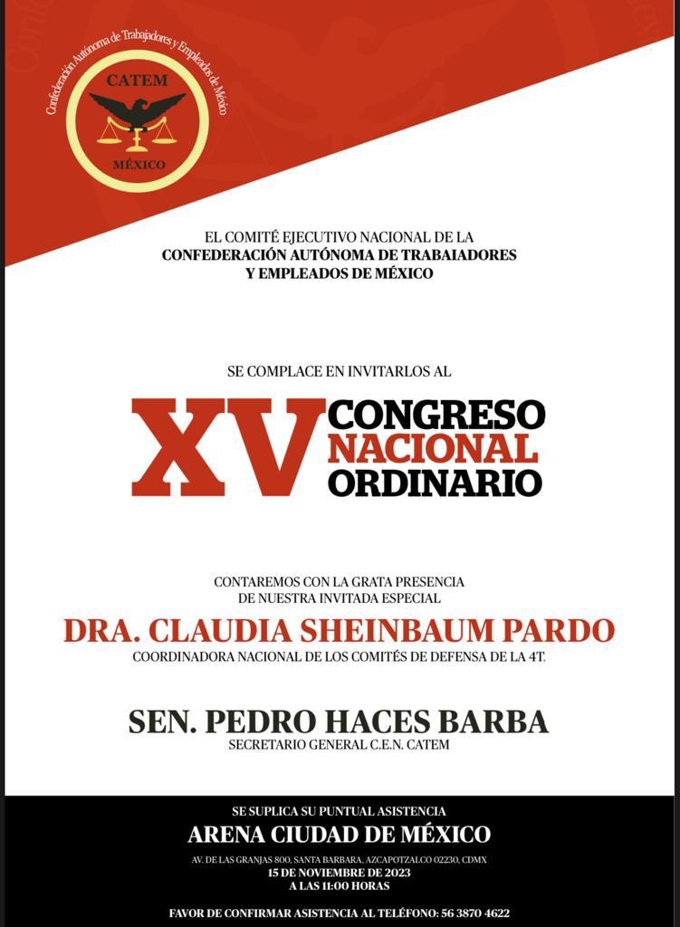 Ahí mismo y ante 25 mil delegados de la Confederación Autónoma de Trabajadores y Empleados de México (CATEM) que se dieron cita en la Arena Ciudad de México, en Azcapotzalco, la doctora Claudia Sheinbaum Pardo, coordinadora Nacional de los Comités de Defensa de la 4ta Transformación, confirmó que hay una coalición entre la CATEM y la 4T.
