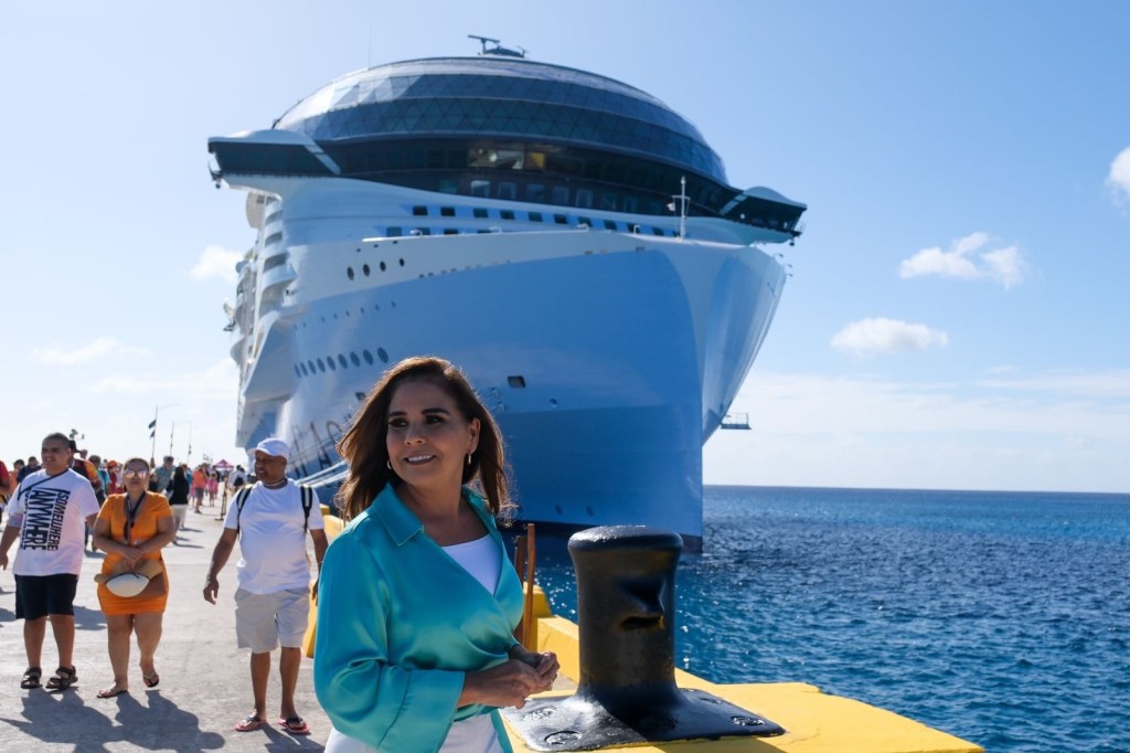 Mahahual.- La gobernadora Mara Lezama dio la bienvenida al crucero más grande del mundo, el Icon of de the Seas de la Royal Caribbean, en el muelle Gran Costa Maya de Mahahual, que atracó esta mañana procedente de Miami, de donde zarpó para su viaje inaugural.