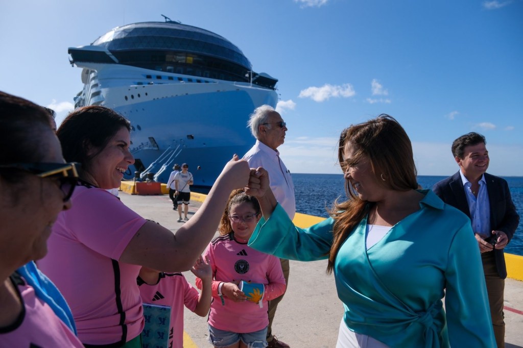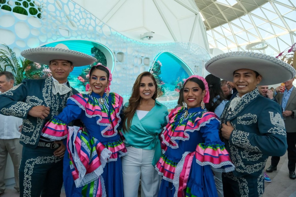 Acompañada de ejecutivos de la Royal Caribbean, Jay Schneider, Vicepresidente Senior de Desarrollo de Producto; James Boink, Vicepresidente; André Pousada, Vicepresidente Regional, y de Jaime A. López, Director Desarrollo de Producto, la gobernadora Mara Lezama afirmó que la llegada del Icon of the Seas significa un nuevo capítulo para la Gran Costa Maya, y refuerza la dedicación al turismo responsable y un futuro vibrante.