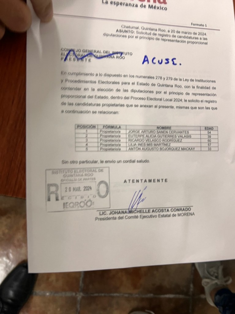 El partido MORENA ha presentado su lista de candidatos para las diputaciones locales por representación proporcional en Quintana Roo, destacando la presencia de Jorge Sanen, el ahora ex presidente del consejo político estatal de la organización.