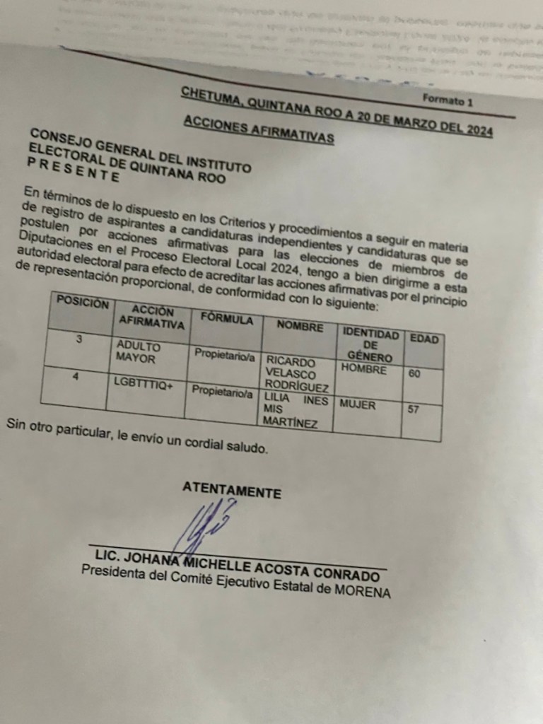 Ricardo Velazco Rodríguez, este último incorporado como acción afirmativa para cumplir con la cuota de adulto mayor al tener 60 años, está en la tercera posición, mientras que la número 4 es, Lilia Inés Mis Martínez quien entra en la lista como representante del sector LGBTTQ+, el último lugar lo ocupa Antón Bojórquez Mackay.
