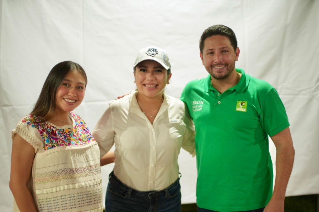 El Secretario General del PVEM, Renán Sánchez Tajonar, presenció el debate junto con la Dirigente del Comité Ejecutivo Estatal de Morena en Quintana Roo, Johana Acosta, y la presidenta municipal de Felipe Carrillo Puerto, Mary Hernández.