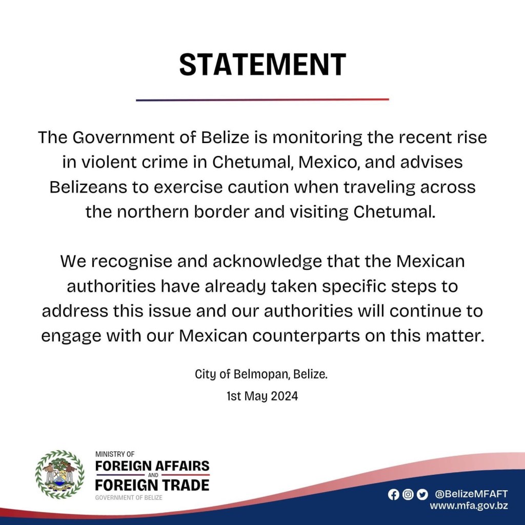 El comunicado, compartido por el Ministerio de Relaciones Exteriores y Comercio Exterior de Belice, alerta sobre el aumento de delitos violentos en Chetumal y aconseja a los beliceños que cruzan la frontera norte que sean cautelosos durante su visita a esta localidad.