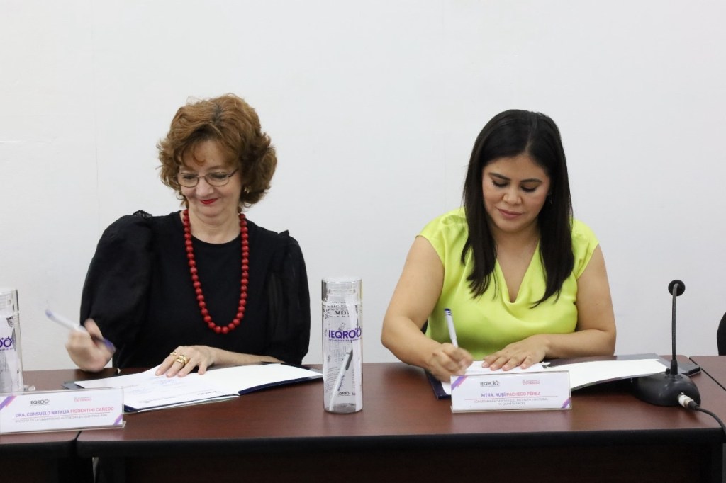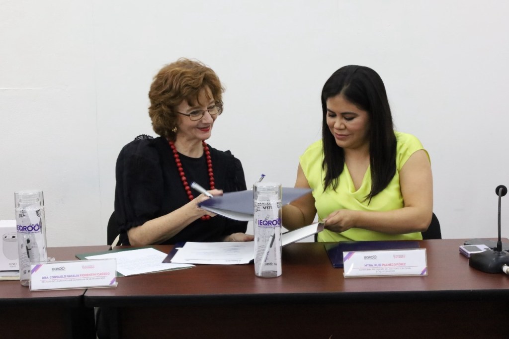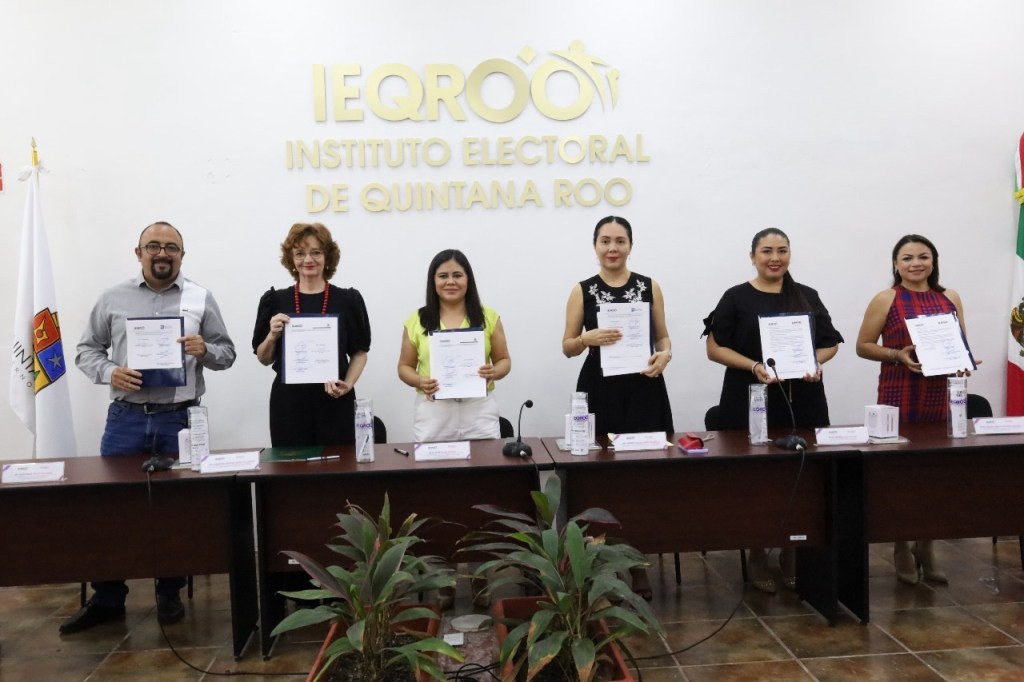 Chetumal.- “Este 2 de junio tenemos un compromiso muy importante, un compromiso con la democracia, un compromiso con nuestra comunidad, un compromiso con nuestro País y ese compromiso es acudir a nuestra casilla y ejercer nuestro derecho al voto”, señaló la Consejera Presidenta del Instituto Electoral de Quintana Roo, Rubí Pacheco Pérez, en el marco de la firma de convenio con la Universidad Autónoma de Quintana Roo; la Universidad Politécnica de Bacalar y la Universidad Interamericana para el Desarrollo Campus Chetumal, evento realizado en la sala de sesiones del Instituto.