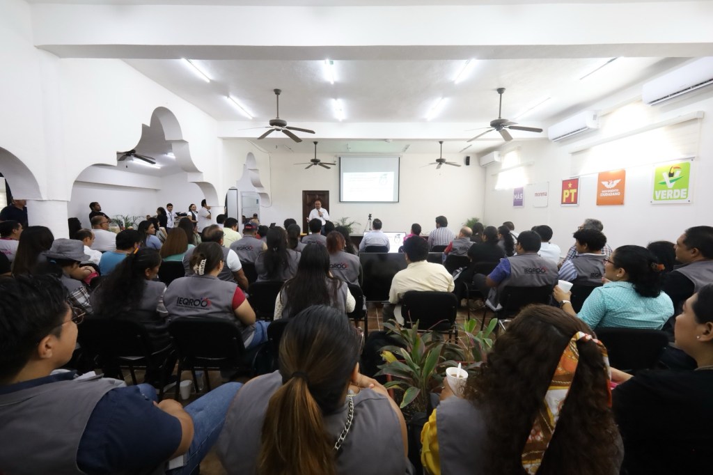 Reunidos en la sala de sesiones del Instituto Electoral de Quintana Roo (IEQROO), en el marco del curso-taller y simulacro respecto a las sesiones de cómputo, dirigido a las consejeras, consejeros, vocalías y supervisoras, supervisores electorales, capacitadoras y capacitadores asistentes electorales, así como, de representantes de los partidos políticos, también estuvieron presentes, la Consejera Presidenta del Instituto, Rubí Pacheco Pérez; las consejeras, Claudia Ávila Graham; Elizabeth Arredondo Gorocica; María Salomé Medina Montaño; Adrián Amilcar Sauri Manzanilla y el expositor Juan César Hernández Cruz.