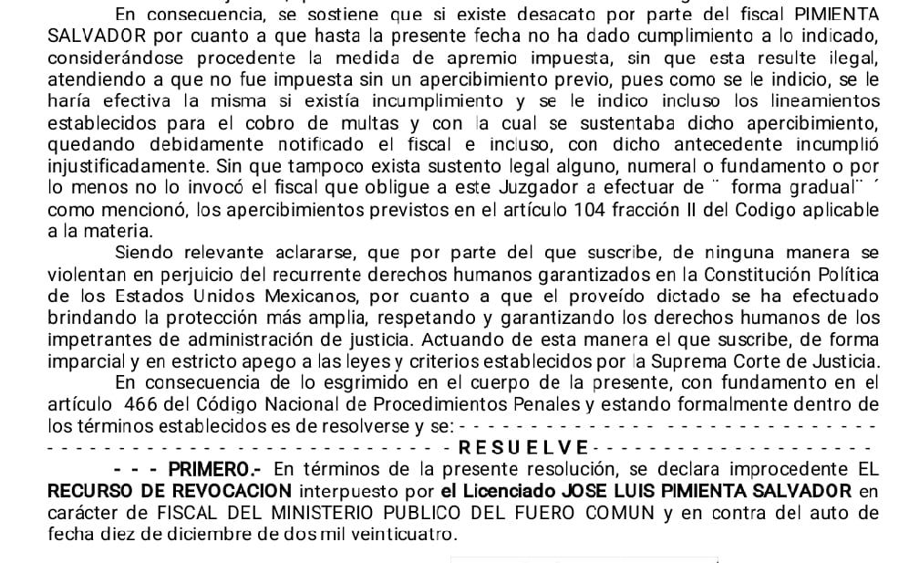 El intento del fiscal José Luis Pimienta Salvador de apelar su sanción fue declarado improcedente por un Juez de Control. En su defensa intentó justificar su inacción argumentando que no tenía obligación legal de supervisar personalmente la diligencia y que existían inconsistencias en la identificación del predio. Sin embargo, el juez desestimó estos planteamientos, calificándolos como excusas maliciosas. Además, subrayó que el desacato reiterado refleja una falta de comprensión jurídica y un actuar deliberadamente omiso por parte de la Fiscalía.