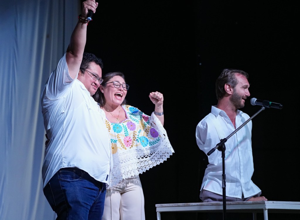 Cozumel.- En una mañana cargada de emoción y sonrisas, el presidente municipal de Cozumel, José Luis Chacón Méndez, acompañado de su esposa, Diana Sosa Blanco, presidenta honoraria del DIF, dió la bienvenida una vez más al conferencista internacional Nick Vujicic, quien regresó a la isla para compartir su inspirador mensaje con más de 700 jóvenes estudiantes isleños de secundaria y preparatoria.