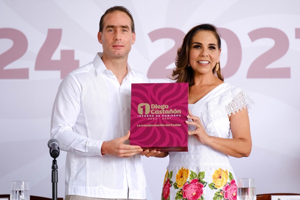 En el domo doble de la unidad deportiva, el presidente Diego Castañón entregó a la gobernadora Mara Lezama, a los representantes de los poderes y a los regidores, el libro que contiene el informe del estado que guarda la administración municipal, para luego darle un mensaje al pueblo de Tulum.