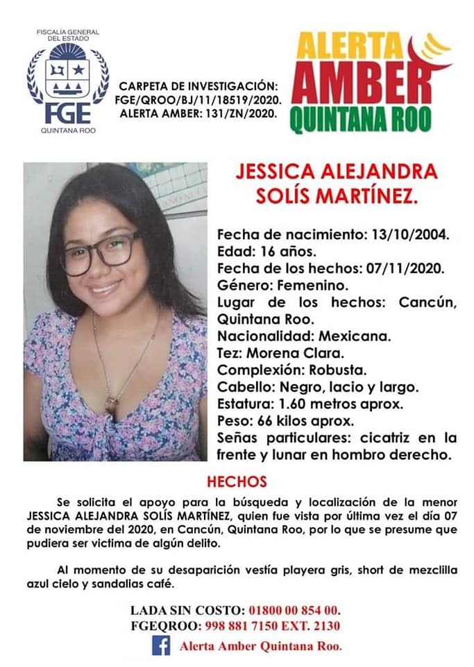 Las autoridades de la Fiscalía General del Estado han activado la búsqueda y el protocolo alba, debido a que la joven se encuentra desaparecida desde el día 7 de noviembre. La cédula de búsqueda y localización de Protocolo Alba para Jessica Alejandra Solís Martínez, es la siguiente. Para cualquier información sobre su paradero, favor deSigueSigue leyendo «OTRA JOVEN DESAPARECIDA EN CANCÚN»