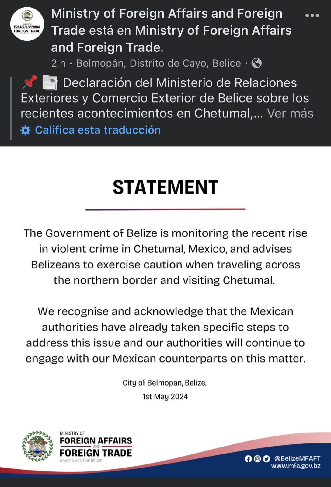 El gobierno de Belice ha emitido una advertencia a sus ciudadanos que viajan a México, específicamente a la ciudad de Chetumal, instándoles a extremar precauciones debido a recientes incidentes de violencia. El comunicado, compartido por el Ministerio de Relaciones Exteriores y Comercio Exterior de Belice, alerta sobre el aumento de delitos violentos en Chetumal ySigueSigue leyendo «Lanzan warning por autoridades Beliceñas a sus ciudadanos, señalan extremar precauciones al visitar Chetumal»