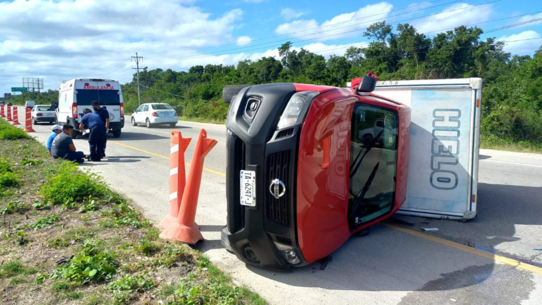 CAMIONETA REPARTIDORA DE HIELOS VUELCA EN LA CARRETERA PLAYA DEL CARMEN – CANCÚN