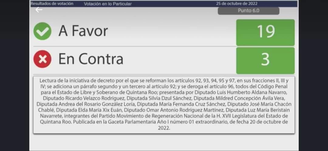 En Fast-Track y con una votación de 19 votos a favor y 3 en contra, los diputados de la XVII legislatura llevaron a cabo la aprobación de la despenalización del aborto en Quintana Roo, por lo que ahora ya no podrá catalogar como aborto a la interrupción del embarazo está situación siempre y cuando se haga enSigueSigue leyendo «Aprueban despenalización del aborto hasta antes de las 12 semanas»