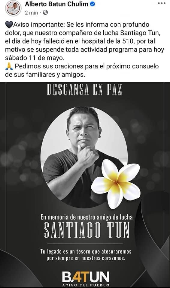 El coordinador de campaña del candidato de Morena, Alberto Batun, en Cancún, Santiago Tun, fue asesinado esta madrugada. Fue víctima de un homicidio en la madrugada del sábado, en la región 519 por lo que la Fiscalía General del Estado (FGE) ha iniciado una carpeta de investigación por homicidio calificado en su contra. Santiago Tun,SigueSigue leyendo «Santiago Tun coordinador de campaña de Morena es asesinado en Cancún»